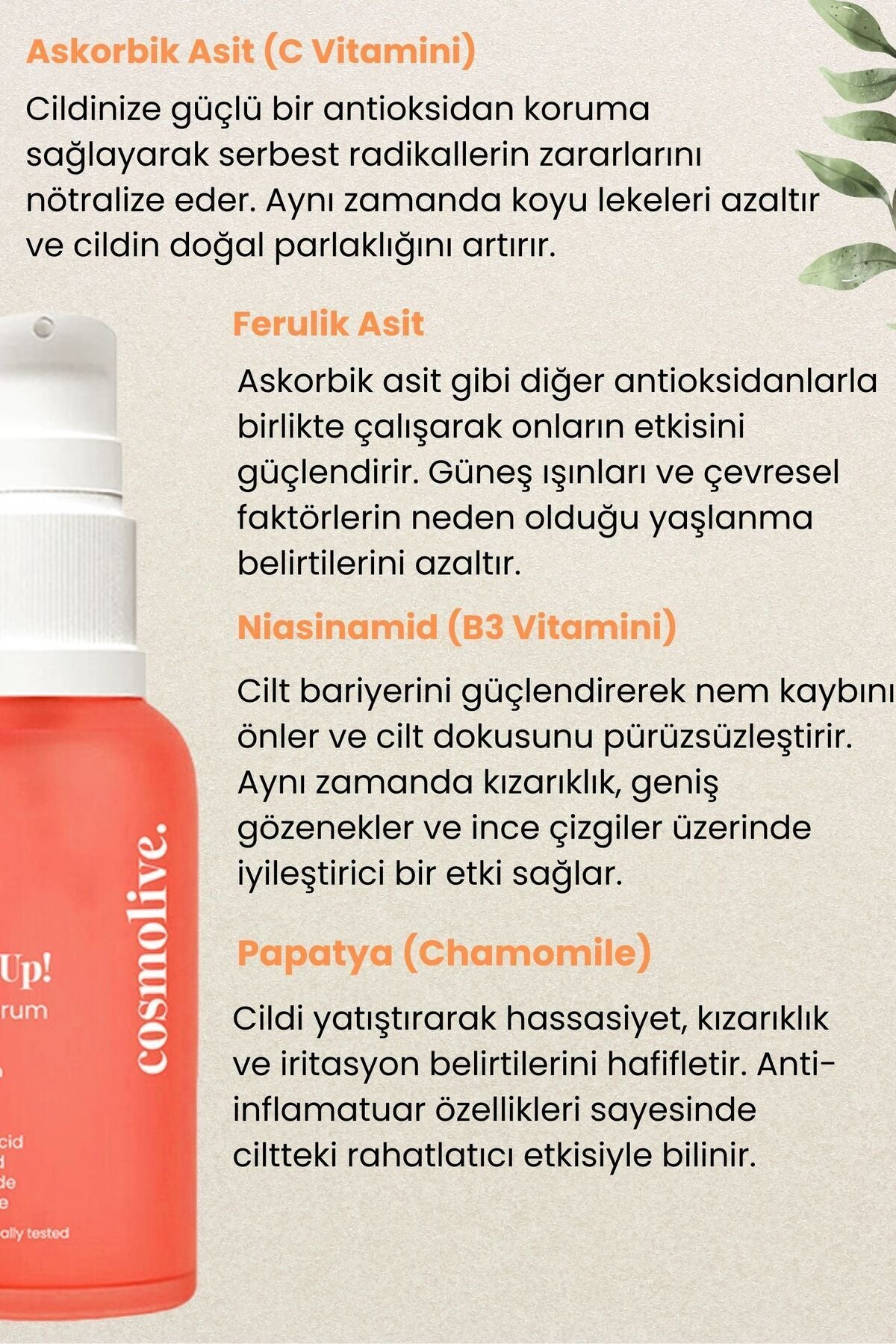 Askorbik Asit (C Vitamini), Ferulik Asit ve Niacinamide (B3 Vitamini) içeriğiyle cildi çevresel etkenlere karşı korur, antioksidan etki sağlar ve leke görünümünün azalmasına yardımcı olur.