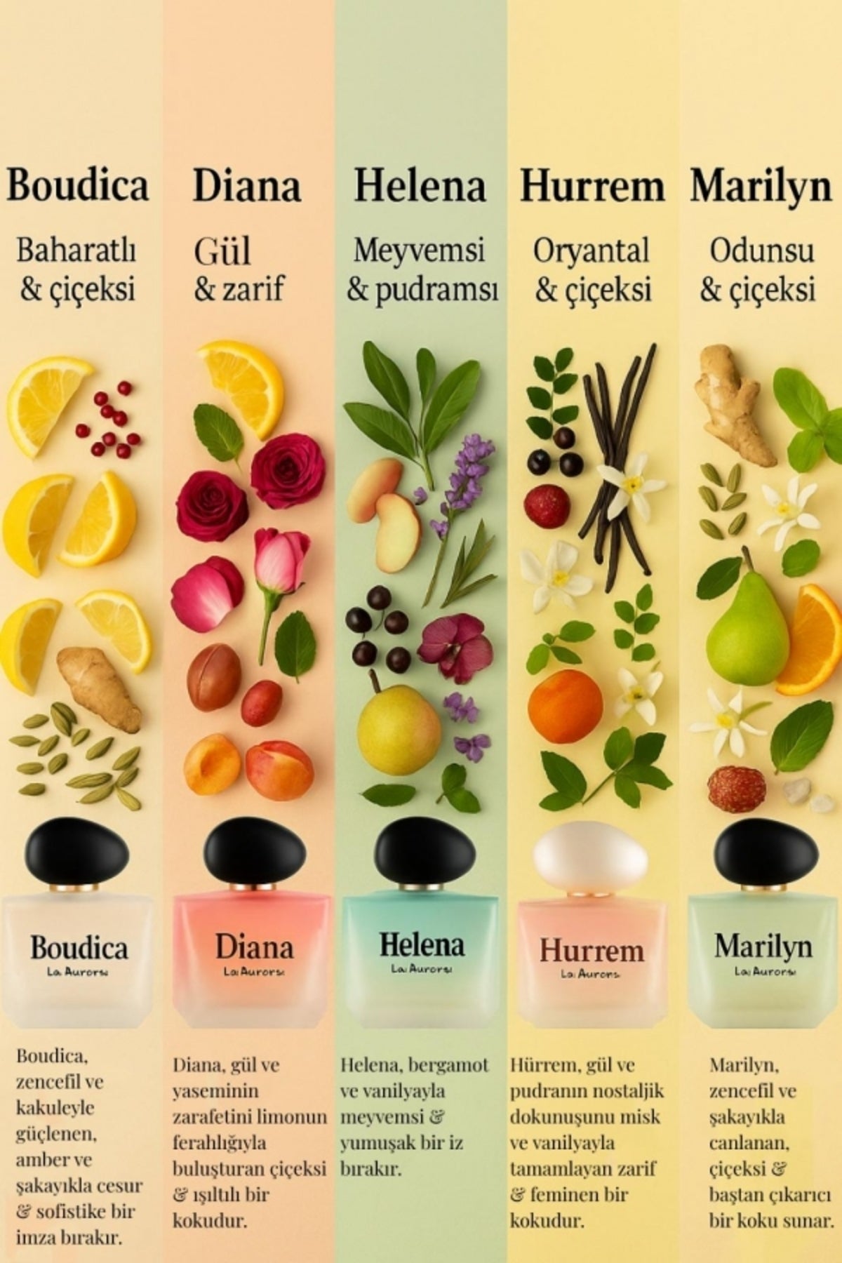 La Aurora Diana Parfüm, canlı, romantik ve zarif notalarıyla modern kadının enerjisini yansıtır. Üst notalardaki limon ve pembe biber, ferah ve dinamik bir açılış sunarken; gül, liçi, şeftali ve yasemin kalp notalarında şık bir çiçek buketi oluşturur.